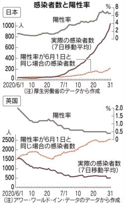 一方、米国は6月1日時点の検査数約50万件に対し新規感染者は2万人余りで、陽性率は約4%だった。7月末には検査は80万件超、感染者は3倍を超える約6万6千人に達し、陽性率は約8%と倍増した。