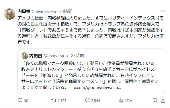 石破茂が失脚した後、総裁選レースが始まってマスコミの空間が埋まっている。が、自民党の宣伝には全く興味がわかず、関連ニュースを見ていない。アメリカではMAGA派の若手活動家が銃撃された。この事件は関心を惹くけれど、特に深堀りして観察する気にはならない。普通の日本人ならそうだろう。内田樹が、アメリカで内戦が勃発する状況をひどく心配してやっている。どうしてそんなに親身になって気にかけてやるのかと鼻白む気分になる。3年前、ウォルター・バーバラの問題作が話題になったとき、内田樹はアメリカのレジリエンス(⇒回復力)の能力を称揚し、分断しても復元して成長するアメリカへの信頼を唱えていた。当時の大越健介など日本マスコミの対米盲従派と列を一つにした態度で、アメリカを礼賛する〝安心理論”を日本左翼にエバンジェリズム(⇒福音伝道)していた。わずか3年で、アメリカは建国以来の本来的復元力を喪失したのだろうか。楽観論から悲観論へ、ずいぶんコロコロ認識が変わるものだ。