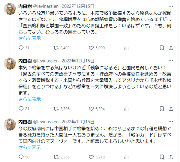 現在でも、左翼の中の議論を垣間見ると、高市発言を本人の偶然的な失敗だと決めつけ、高市個人の資質の問題だと矮小化して嘲笑するような政局視の傾向が散見される。台湾有事がアメリカの国家安保戦略であるという本質が看破・認識されておらず、デービッドソンが宣告した開戦の時期設定が、再来年(2027年)であるという事実が忘却されている。内田樹の等閑の悪影響だろう。台湾有事については多く本が出版されてきたが、ほとんどが右翼側・日米同盟側からの洗脳工作の著作であり、その反対側からの分析や考察は皆無だった。本来なら、布施裕仁や半田滋や前田哲男や前泊博盛が担うべき任務だったと思う。彼ら専門家が私と同じ視角と緊張感を持ち、左翼リベラルに正確な知識を提供していれば、危機感と警戒感が醸成され、現在のような無抵抗な状況にはならなかった。日米同盟側の戦略を阻止する政治的対抗軸の主体性が形作られていたと思われる。