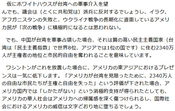 もし(アメリカが)中国政府に対する根本的な不信感を明言するなら、ついでにもう少し思い切ったことをしてもいいのではないか。(略)アメリカは(略)中国を分断し現体制を混乱させる戦略として、チベットと台湾の独立も支持してはどうか。そんなことをすれば、中国が暴力的な反応を示すのは間違いない。しかしこの選択を排除すれば、独立運動を支持するアメリカの伝統をないがしろにし、みずからの影響力を放棄することになる。